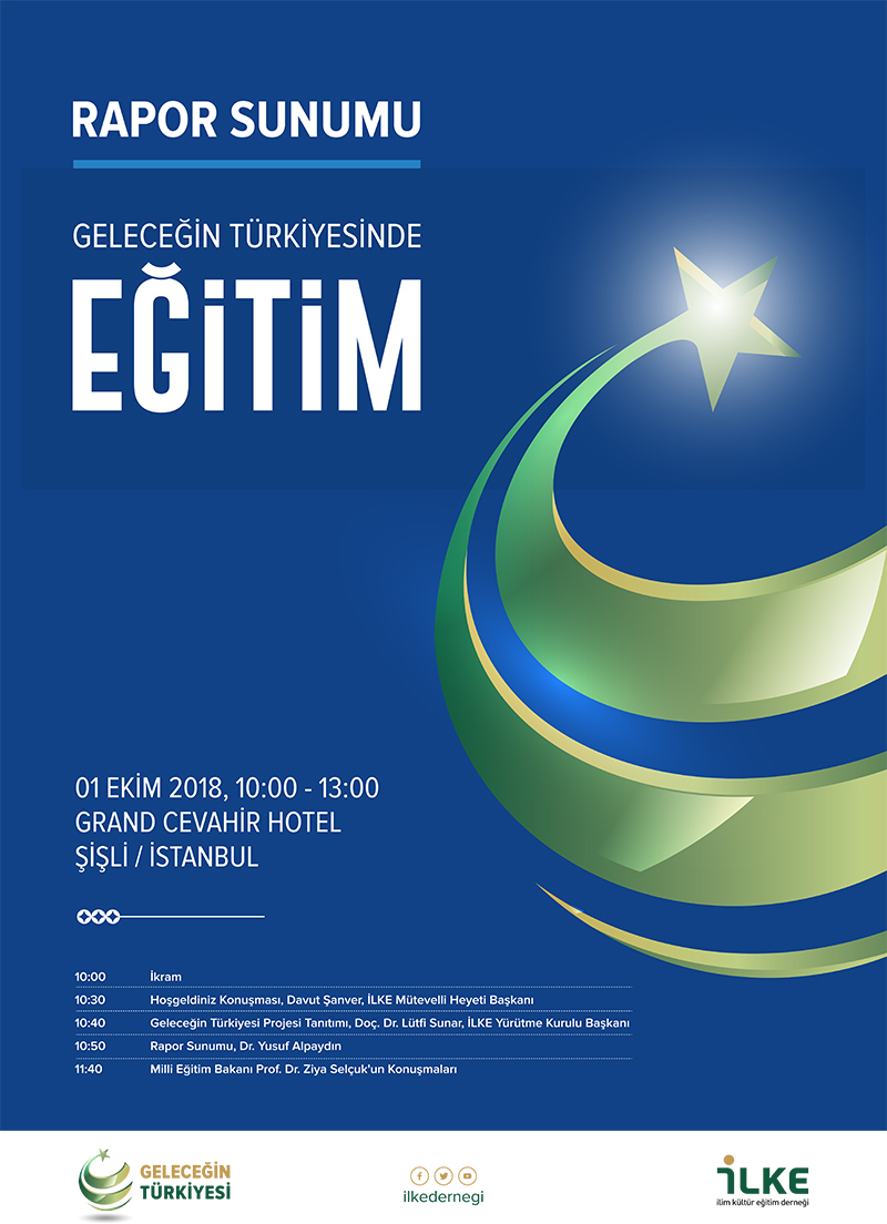 Geleceğin Türkiyesi adıyla gerçekleştirilecek projede eğitimden yükseköğretime, sivil toplumdan dış politikaya, siyasetten yönetime kadar birçok alanda alanında uzman kişilere gelecek vizyonu çizen ve çözüm öneren raporlar hazırlatılıyor. Proje, 1 Ekim 2018’de Milli Eğitim Bakanı Prof. Dr. Ziya Selçuk’un da katıldığı bir törenle Grand Cevahir Otel’de kamuoyuna tanıtılacak.