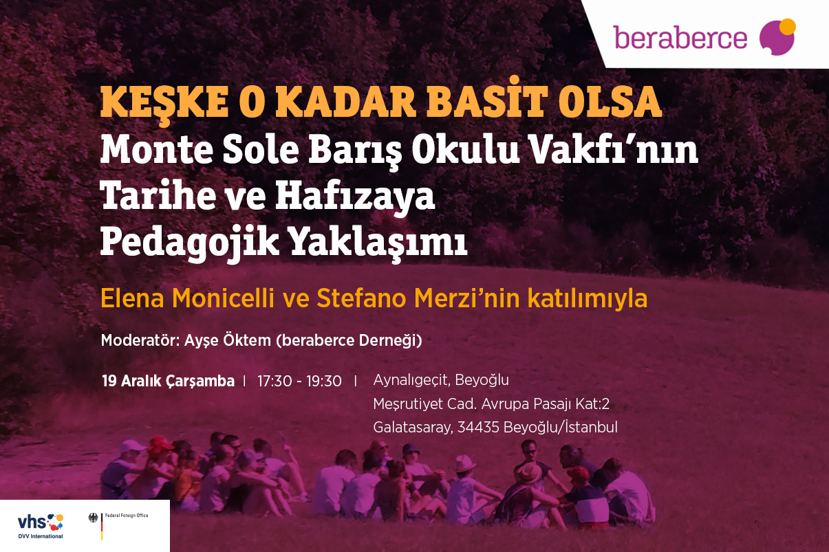 beraberce Derneği 19 Aralık Çarşamba günü saat 17.30’da, Beyoğlu’nda bulunan Aynalı Geçit’te Monte Sole Barış Okulu Vakfı’dan Elena Monicelli ve Stefano Merzi’nin katılımıyla bir panel gerçekleştirecek.