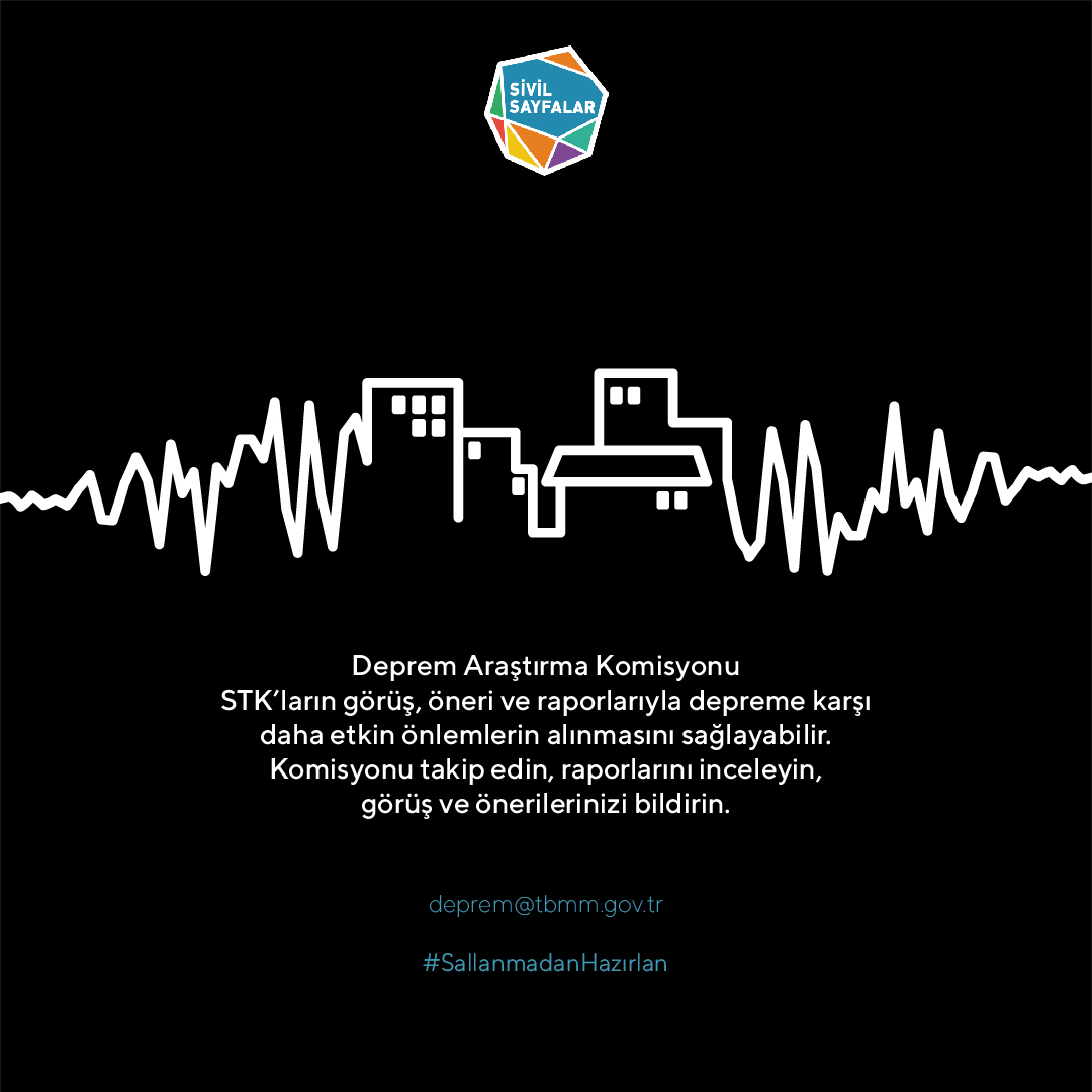 Sivil Sayfalar; Sivil Toplum İçin Destek Vakfı ve Turkey Mozaik Foundation desteğiyle düzenlediği kampanyada, sivil toplum kuruluşlarını Meclis Deprem Komisyonu'na görüş, öneri ve başvurularla katkı sunmaya çağırıyor.