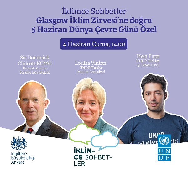 4 Haziran Cuma günü saat 14:00’te UNDP İyi Niyet Elçisi Mert Fırat’ın sunuculuğunda gerçekleşecek çevrim içi etkinliğe Birleşik Krallık Türkiye Büyükelçisi Sir Dominick Chilcott KCMG ve UNDP Türkiye Mukim Temsilcisi Louisa Vinton konuşmacı olarak katılacak. İklimce Sohbet, 5 Haziran Dünya Çevre Günü’nün hemen öncesinde herkesi İklimce düşünmeye davet ediyor.