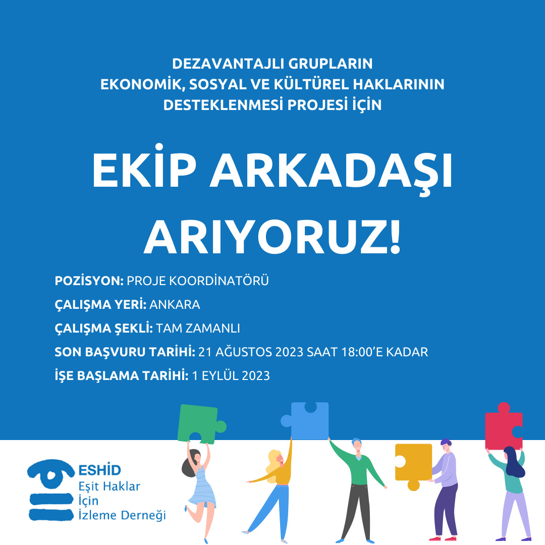 Eşit Haklar İçin İzleme Derneği, Avrupa Birliği’nin desteği ve İnsan Hakları Bilgi ve Belge Sistemleri (HURIDOCS) ile iş birliği içinde yürüttüğü 'İzleme ve Savunuculuk Ortaklıkları Yoluyla Türkiye’deki Dezavantajlı Grupların Ekonomik, Sosyal ve Kültürel Haklarının Desteklenmesi' projesinde görev almak üzere proje koordinatörü arıyor.