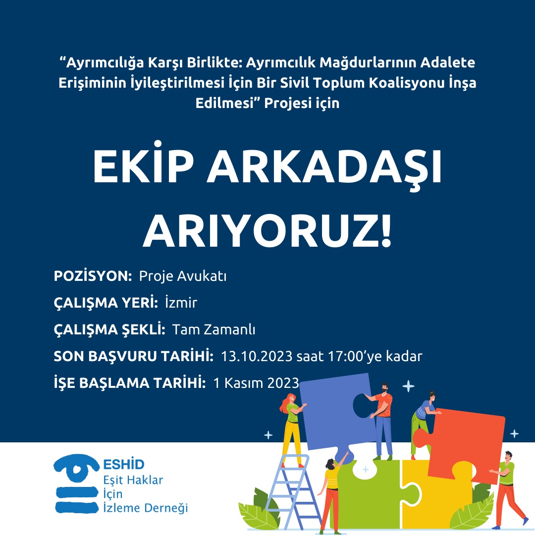 Eşit Haklar İçin İzleme Derneği (ESHİD), Avrupa Birliği tarafından finanse edilen 'Ayrımcılığa Karşı Birlikte: Ayrımcılık Mağdurlarının Adalete Erişiminin İyileştirilmesi İçin Bir Sivil Toplum Koalisyonu İnşa Edilmesi' projesi kapsamında 14 ay süreyle Proje Avukatı arıyor.