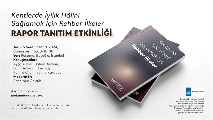 Mekanda Adalet Derneği, 2 Mart 2023 Cumartesi günü gerçekleştireceği 'Kentlerde İyilik Hâlini Sağlamak İçin Rehber İlkeler' başlıklı raporun tanıtımına davet ediyor.