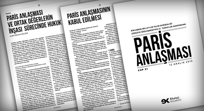 “Herkes için iklim adaleti” diyen Ekoloji Kolektifi Derneği, 21. Birleşmiş Milletler İklim Değişikliği Taraflar Konferansı sonucunda (COP21) 12 Aralık 2015 tarihinde kabul edilen Paris Anlaşması’nın çevirisini, kendilerinin hazırladığı bir önsöz metniyle birlikte yayımladı. Çalışma, hem anlaşmayı değerlendiriyor hem de Türkçe çevirisinin tam metnini içeriyor.