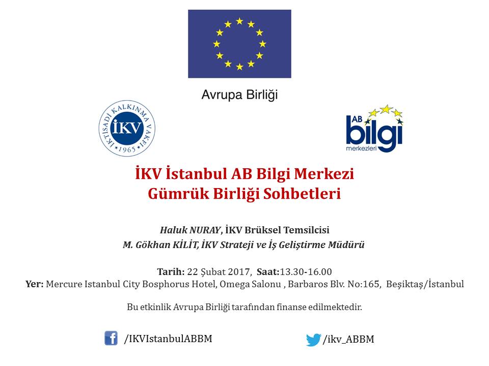 İktisadi Kalkınma Vakfı (İKV) AB Bilgi Merkezi tarafindan 22 Şubat 2017 çarşamba günü düzenlenecek Gümrük Birliği Sohbetleri’ne davetlisiniz. İKV’nin bu haftaki konukları İKV Brüksel Temsilcisi Haluk Nuray ve İKV Strateji ve İş Geliştirme Müdürü M. Gökhan Kilit. Etkinlikte sınırlı sayıda yer olduğundan, lütfen kayıt yaptırırın.