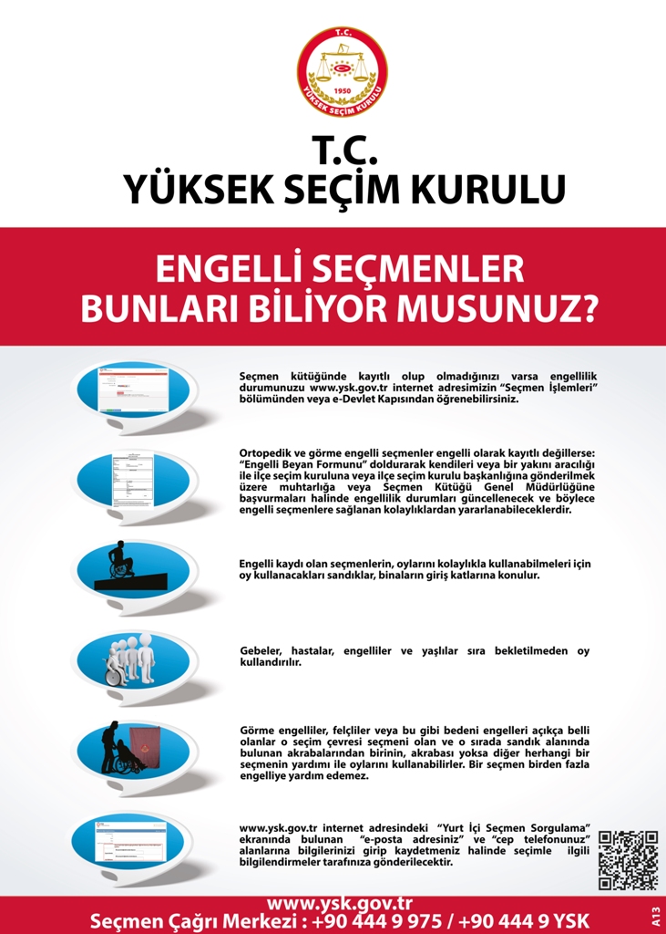 Ortopedik engelliler, yürüme güçlüğü çeken yaşlılar ve görme engellilerin oylarını kullanabilmeleri amacıyla seçim sandıklarına erişebilmeleri için seçim bölgelerindeki muhtarlıklara veya seçim kurullarına YSK Engelli Seçmen Beyan Formu’nu doldurarak askı süresi sonuna kadar teslim etmeleri gerektiğini anımsattı.