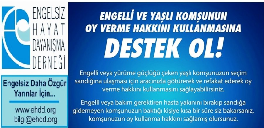 Engelsiz Hayat Dayanışma Derneği olarak, engelli ve yaşlı vatandaşların oy kullanma hakkını sağlıklı bir şekilde yerine getirebilmeleri için ‘Engelli ve yaşlı komşunun oy verme hakkına destek ol’ kampanyası başlattık