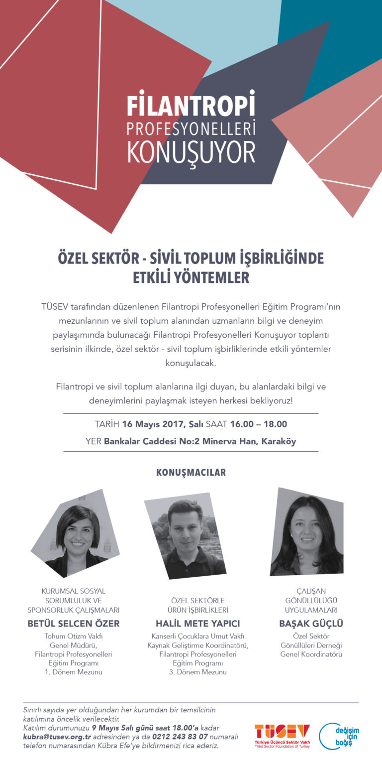 TÜSEV tarafından 2014 yılından beri düzenlenen Filantropi Profesyonelleri Eğitim Programı’nın mezunları ve sivil toplum alanından uzmanların stratejik bağışçılık ve filantropi ile ilgili konularda bilgi ve deneyim paylaşımında bulunacağı Filantropi Profesyonelleri Konuşuyor toplantı serisinin ilki 16 Mayıs 2017 Salı günü gerçekleşecek. Özel sektör ve sivil toplum arasında kurulan işbirliklerinde etkili yöntemlerin konuşulacağı ilk toplantıda Tohum Otizm Vakfı Genel Müdürü ve Filantropi Profesyonelleri Eğitim Programı 1. Dönem Mezunu Betül Selcen Özer kurumsal sosyal sorumluluk ve sponsorluk konuları hakkında, Kanserli Çocuklara Umut Vakfı Kaynak Geliştirme Koordinatörü ve Filantropi Profesyonelleri Eğitim Programı 3. Dönem Mezunu Halil Mete Yapıcı özel sektörle ürün işbirlikleri konusunda, Özel Sektör Gönüllüleri Derneği Genel Koordinatörü Başak Güçlü Elbir ise çalışan gönüllülüğü uygulamaları hakkında bilgi ve deneyim paylaşımında bulunacaklar. Toplantı detayları ve katılım için aşağıdaki davetiyeyi inceleyebilirsiniz.