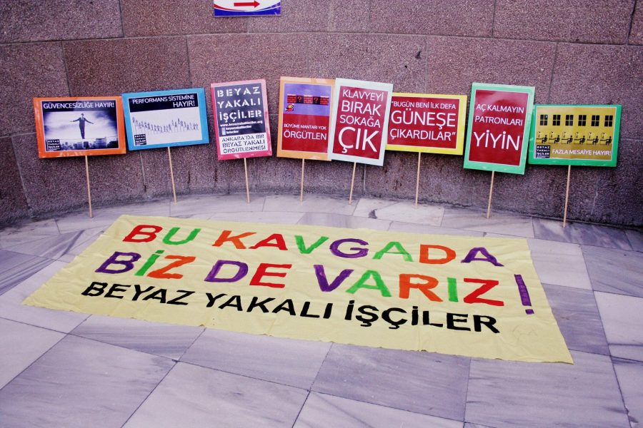 2000’lerin sonundan itibaren Türkiye’de beyaz yakalılar işçi mücadelesinde yerlerini alıyorlar. Beyaz yakalı örgütlenmelerinin önünde kazanılmış hakların savunulması veya kaybedilenlerin geri alınması değil, işçi sınıfı ve kendileri için yeni haklar üretmek, yeni örgütlenme tarzları oluşturmak var.