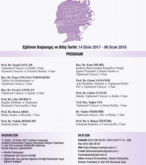 Ankara Üniversitesi Kadın Sorunları Araştırma ve Uygulama Merkezi (KASAUM), Kadın Çalışmaları Anabilim Dalı öğretim üyeleri ile yeterli başvuru olması halinde Toplumsal Cinsiyet Eşitliği Sertifika Eğitim Programı düzenleyecektir. Düzenlenecek sertifika programı, 14 Ekim 2017 tarihinden 6 Ocak 2018 tarihine kadar 11 hafta sürecektir. Detaylı bilgiye KASAUM’UN web sayfası linkinden ulaşabilirsiniz.