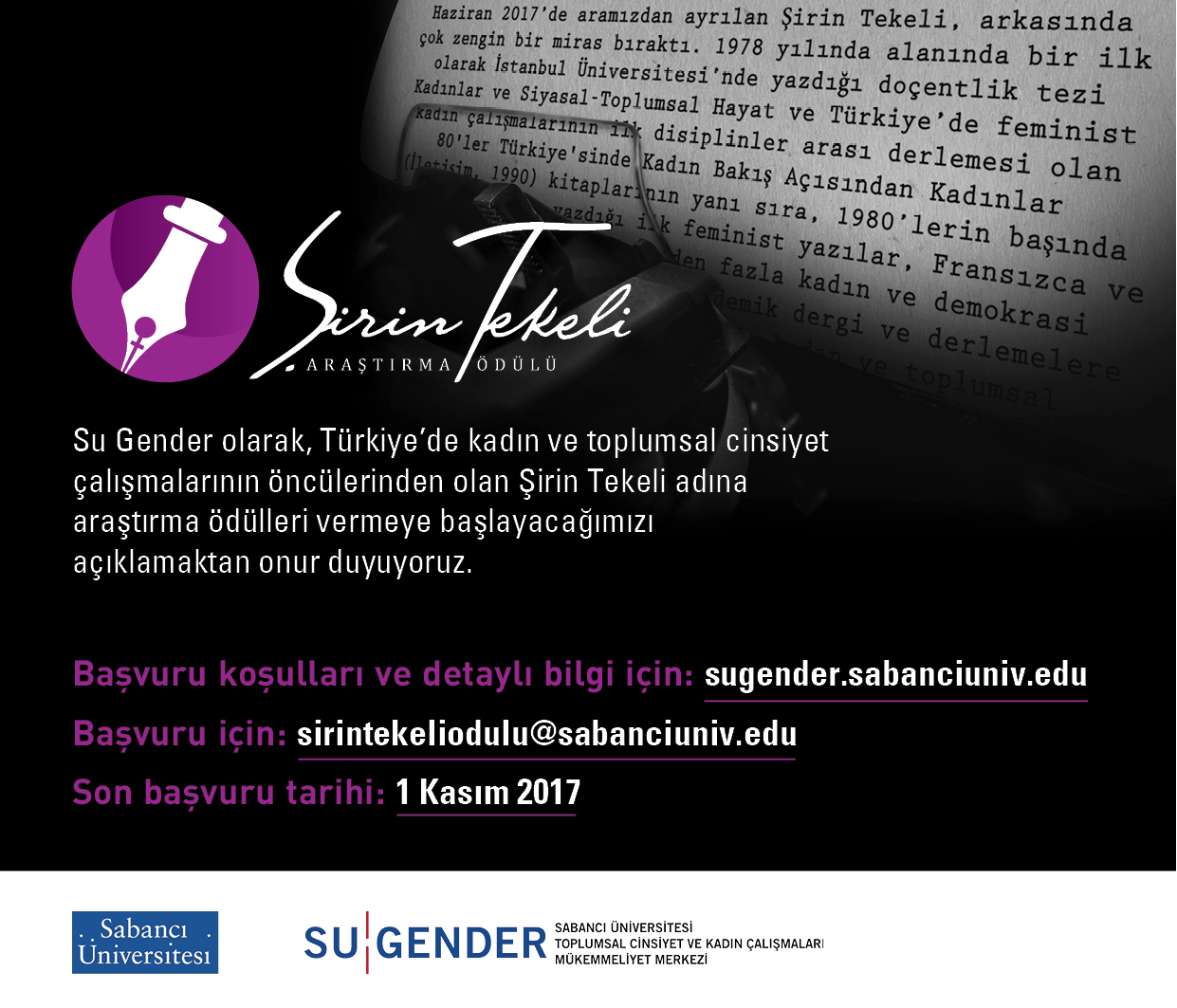 Sabancı Üniversitesi Toplumsal Cinsiyet ve Kadın Çalışmaları Merkezi (SU Gender) olarak, Türkiye’de kadın ve toplumsal cinsiyet çalışmalarının öncülerinden olan Şirin Tekeli adına araştırma ödülleri vermeye başlayacağımızı açıklamaktan onur duyuyoruz. Son başvuru tarihi 1 Kasım 2017′dir. Başvuru koşullarını aşağıda görebilir, detaylı bilgiye ilgili linkten ulaşabilirsiniz.
