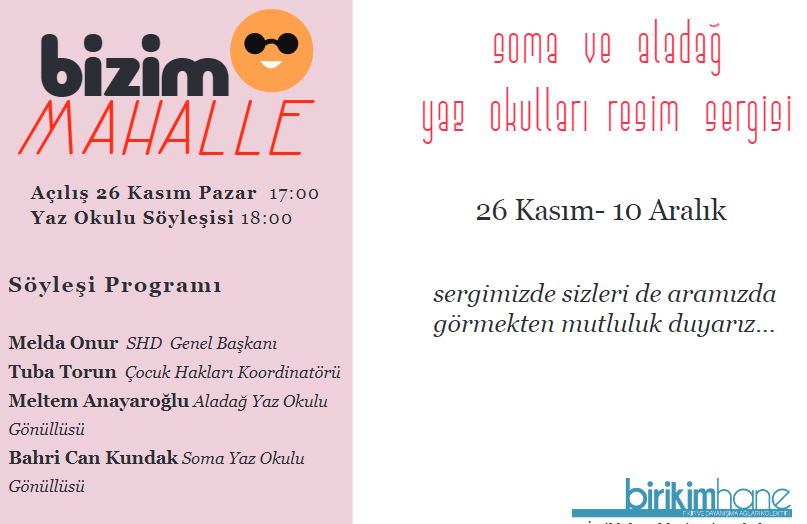 Sosyal Haklar Derneği bu yıl Soma’da üçüncüsünü yaptığı, Aladağ’da da ilk kez yapılan yaz okullarında çocukların yaptığı işleri “Bizim Mahalle” adlı sergide Beyoğlu Mis Sokak’ta 26 Kasım ile 10 Aralık tarihleri arasında sergileyecek. Sosyal Haklar Derneği’nin duyurusu şöyle: