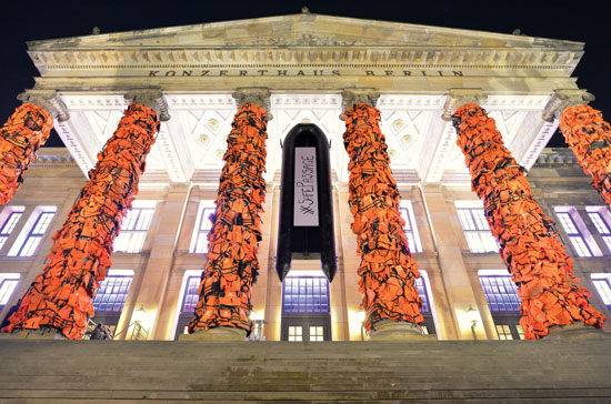 Ai Weiwei’nin yakın zamandaki eserlerinin çoğu mülteciler temasındaki işlerden oluşturuyor. Berlin Konzerthaus’un girişindeki dev kolonları mültecilere ait binlerce can yeleğiyle kapladığı yerleştirmesinde tarihsel ve politik bir felaketin ciddi bir betimlemesi yatıyor. Çin Hükümeti’nin koyduğu yasakla senelerce evinden çıkması yasaklanan biri olarak, yönetmenliğini üstlendiği, evine dönmek isteyen ama dönemeyen mülteci nüfusu konu alan “Human Flow” (İnsan Seli) belgeselindeki insan hikayeleri görünmeyeni görünür kılıyor.
