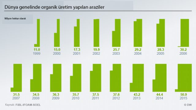 2015 yılında dünyada organik tarım yapılan arazi 50,9 milyon hektar; yani dünya genelindeki tarım arazilerinin henüz %1’i. FiBL, gıda israfı yarı yarıya azaltılırsa ve kesif yem üretimi (yem amaçlı tahıllar vb) yarıya düşürülürse, mevcut tarım alanlarının % 60’ında dahi organik tarıma geçilmesiyle, hem verim hem de sürdürülebilirlik açısından 2050 yılında sağlıklı bir üretimin sağlanabileceğini belirtiyor.