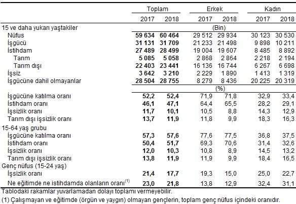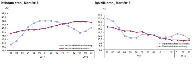 TÜİK’in verilerine göre, Mart 2018’de işsizlik oranı geçen yılın aynı dönemine göre 1,6 puanlık azalış göstererek yüzde 10,1 olarak gerçekleşti. Genç nüfusta işsizlik oranı yüzde 17,7 oldu.