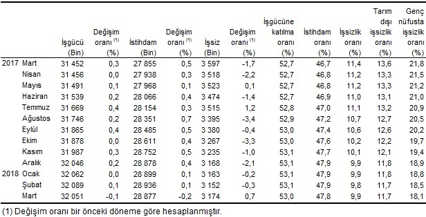 İstihdam edilenlerin sayısı 2018 yılı Mart döneminde, bir önceki yılın aynı dönemine göre 1 milyon 10 bin kişi artarak 28 milyon 499 bin kişi, istihdam oranı ise 1 puanlık artış ile yüzde 47,1 oldu.