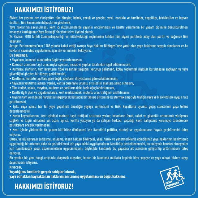 Herkesi katılmaya, güç birliğine davet ediyoruz çünkü bu dernek onlar için bir şeyler yapmayı amaçlıyor. Bu girişim herkes için, yayalar ve engeliler için daha iyi koşullar sağlanması için ortaya konan bir güç birliği. Bizler, en azından taşıtlardan korunmuş alanlar, sürekliliği olan yaya şebekeleri oluşturmak amacıyla çalışıyoruz. Bu tür düzenlemelerle kaliteli ve çağdaş bir yaşam ve kent mekanı oluşmasını hedefliyoruz. Yayaların kente ve ulaşım yatırımlarına farklı bir gözle bakmaları gerektiğini düşünüyoruz. Kentlerin tuğlası insandır, yaya olanakları ve yaya olmak da bu tuğlalar arasındaki harçtır. Tuğlaları yani kentsel faaliyetleri birleştiren harç da yürümedir, dolayısıyla sağlıklı bir kent yapısı ve yaşantısı için bu ikisinin arasındaki ilişkinin güçlü kurulması gerekir. Harcı, yani yürüme olanakları kaliteli ve yeterli olmayan binanın tuğlaları dökülecektir. Sağlıklı kent, sağlıklı ve mutlu insanlar için birleştirici güç olan yayalık zorunlu bir unsurdur. Kentliler, kendileri ve kentleri için yürümenin ne kadar önemli olduğunu anladıkça haklarını daha fazla koruyacak, yürüme ile kentlerine daha çok sahip çıkacaktır.