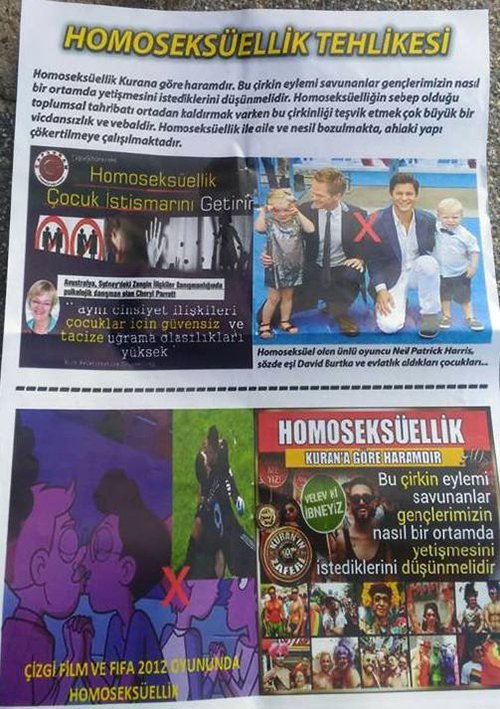 Osmaniye’de dağıtılan bildirilerde, “homoseksüellik çocuk istismarını getirir” gibi ifadeler, ABD’li oyuncu Neil Patrick Harris, eşi ve çocuklarının bulunduğu bir fotoğrafla birlikte kullanıldı.
