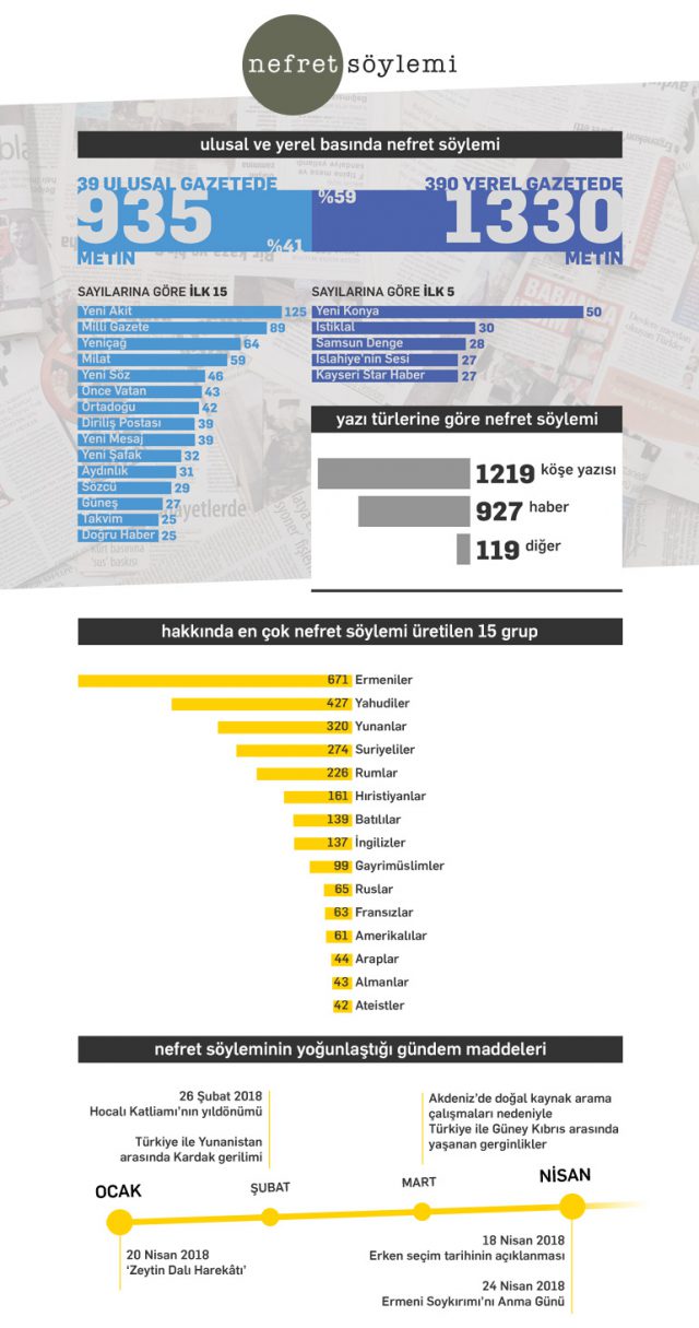 Medyada Nefret Söyleminin İzlenmesi araştırmasının 2018 yılı Ocak-Şubat-Mart-Nisan aylarını kapsayan dört aylık döneminde ulusal, etnik ve dini grupları hedef alan 2265 köşe yazısı ve haber tespit edildi. 105 yayında, birden fazla gruba yönelik farklı kategorilerde nefret söylemi üretildiği için bu yazılar ele aldıkları grup/kategori sayısı kadar (birden fazla defa) incelenmiş oldu ve 2370 yazıya ulaşıldı. İncelenen tüm yazılarda 76 farklı grup hakkında 3076 adet nefret söylemi içeriği bulundu.