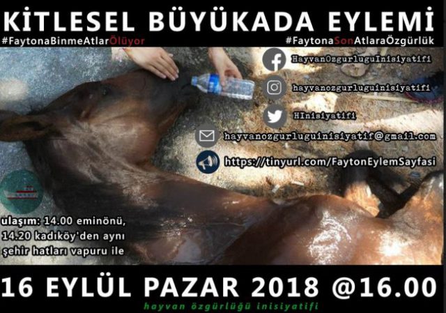 Kavurucu sıcaklarda dur durak bilmeden koşturuldukları için ayakları kanayan, kış olunca öylece bir kenara bırakılan, acısı ve çaresizliği ancak yorgun gözlerinin içine bakıldığında görülen, bir parça ot ve birkaç yudum su ile idare etmesini öğrenmek zorunda kalan, turizm ve nostaljinin köleleri atların, sırtlarında şaklayan kamçıdan azad olmaları için, vicdana, sağduyuya ve adalete sığmayan bu kanlı sektörün çarklarının durması için Adalar’da, Türkiye’nin diğer illerinde ve yeryüzünün herhangi bir noktasında kullanılan atların özgürlüğü için, “daha iyi” şartlar değil, atlar için bir zulüm olan faytonculuk sektörünün kaldırılmasını ve atların ömürleri boyunca kullanılmadan yaşaması için güvence talep edelim.”