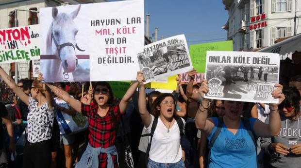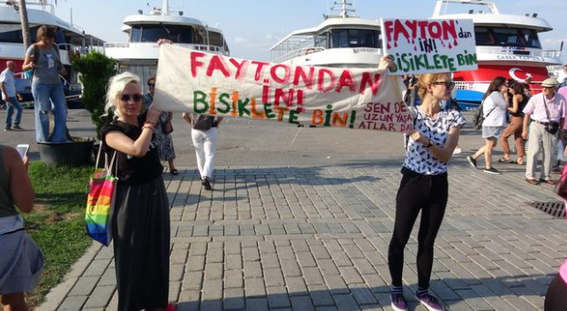 Büyükada iskele meydanında bir araya gelen hayvan özgürlüğü aktivistleri, “Faytondan İn Bisiklete Bin”, “Faytona Son Atlara Özgürlük”, “Hayvanlar İçin Ses Çıkar”, “Hayvanlar Özgür Olmak İstiyor” yazılı pankartları taşıyarak fayton kullanımına dikkati çekti.