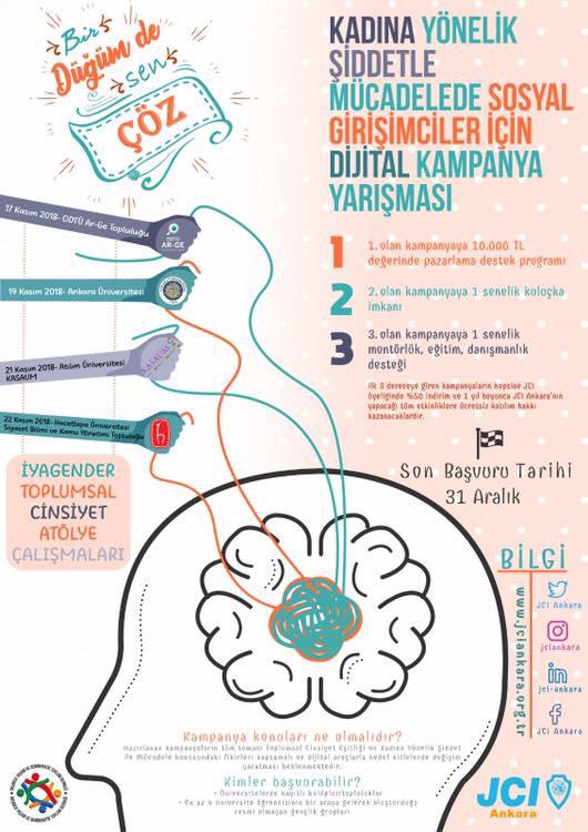İYADER ve JCI Ankara Kadına yönelik şiddetin önlenmesi amacıyla yeni bir proje hazırladı. 25 Kasım Kadına Karşı Şiddetle Mücadele Günü olması nedeniyle; *"Bir Düğüm de Sen Çöz”* mottosuyla, sosyal girişimcilerin yetiştirilmesini ve bu gençlerin hazırladıkları projelerle Türkiye genelinde ses getirebilecek kampanyaların ortaya çıkmasını amaçlıyor.
