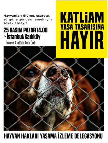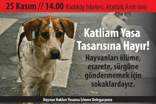 Hayvan Hakları Yasama İzleme Delegasyonu, bu Pazar (25 Kasım), saat 14.00’da, Kadıköy İskele Meydanı’ndaki Atatürk anıtının önünde, “Hayvan Hakları Büyük İstanbul Buluşması”nı organize ediyor. Bürokratlar eli ile yazılmak istenen, bu ısmarlama kadere razı ve ortak olmak istemeyen, vicdanlı, adalete inanan, hakları umursayan herkesi, senelerdir gözünü sokak hayvanlarına dikmiş olanlara, katliam yasa tasarısına karşı tepki vermeye çağırıyorum.