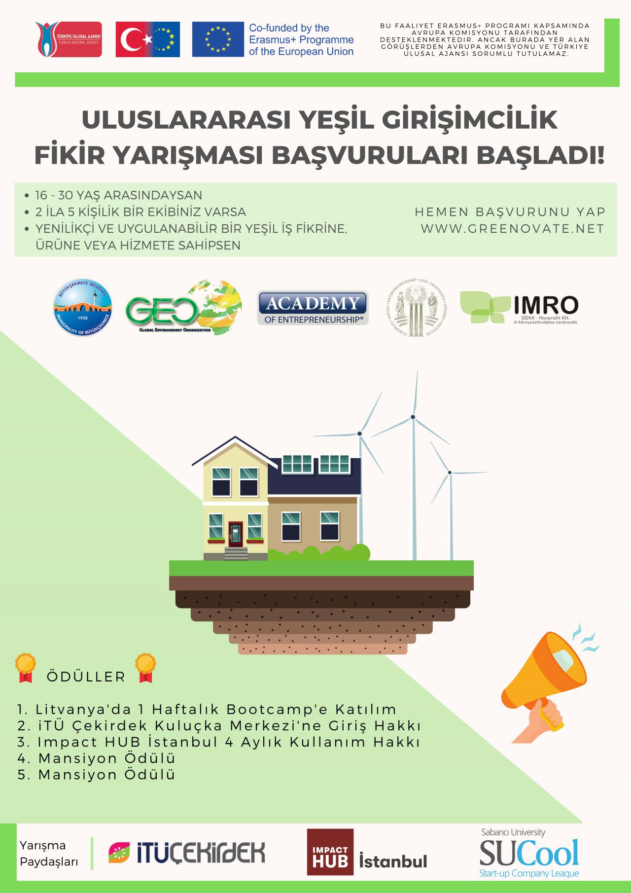 Bu yarışma; “Erasmus+ Programı “Uluslararası Yeşil Girişimcilik ve İstihdam Merkezi” projesi kapsamında Avrupa Komisyonu tarafından desteklenmektedir. Ancak burada yer alan görüşlerden Avrupa Komisyonu ve Türkiye Ulusal Ajansı sorumlu tutulamaz.”