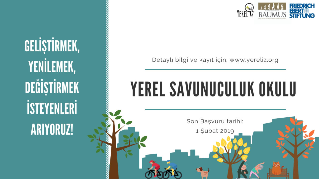 Yerel İzleme, Araştırma ve Uygulamalar Derneği (YERELIZ) ve Bahçeşehir Üniversitesi Göç ve Kent Çalışmaları Merkezi (BAUMUS) işbirliğinde 2018 senesinde ilki gerçekleşen Yerel Savunuculuk Okulu ikinci dönemi 13 Şubat 2019’da başlayacak.