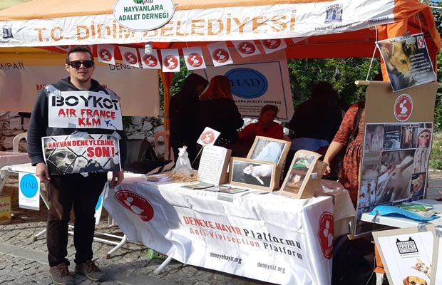 Deneye Hayır Platformu festivalde açtıkları stantta, ziyaretçileri deney hayvanlarına yapılan işkenceler konusunda bilgilendirdi. Platformdan Burak Özgüner, vegan olma öyküsünü ve yaptıkları çalışmaları şöyle anlattı: “2011 yılında çekim için Tuzla’da Avustralyalı bir ekiple çevirmen olarak mezbahaya girmiştim. Oradaki zulme tanık olduktan sonra vegan oldum. Bahsettiğim mezbaha, Balkanların en büyük mezbahası, günde en az 2 bin koyun kesiliyor, ayrıca büyük baş da var. Bu kadar büyük bir yere girmemiştim, onunla birebir yüzleşmek çok zor oldu. Deneye Hayır Platformu’yla Türkiye’nin pek çok yerinde insanları bilgilendirmeye çalışıyoruz. Deneylere dair insanlar pek bir şey bilmiyorlar, çok teknik de bir konu. Endüstri tarafından gizli saklı şekilde gerçekleştirilen bir durum söz konusu. Bu nedenle insanlara anlattığımızda şaşırıyorlar. Her üniversitenin veya deney yapan merkezin kurması gereken yerel etik kurullar var. Bu kurulların onayladığı projeler HADMEK’te (Hayvan Deneyleri Merkezi Etik Kurulu) toplanıyor. Normalde bu kurul deneyleri kategorize ediyor; temel tıp bilimleri, tedavi amacıyla deneyler, davranış üzerine deneyler diye kategoriler var. Bunların yayınlanması gerekiyor. Ama tepki çekmemek adına veya sivil toplum örgütleri, hayvan hakları dernekleri kullanıp kamuoyu oluşturamasın diye bunları açıklamamakta direniyorlar. “