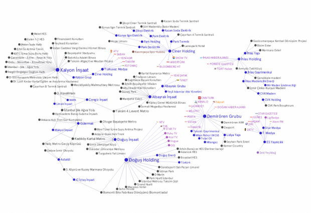 Yıllardır en çok ilgi gören haritamız medya sahipleri ağı, bunda çok da şaşılacak bir şey yok aslında, zira inşaat şirketleri arasında gidip gelen ana akım medya şirketlerini, bu grupların devletten aldıkları ihalelerle yanyana görmek oldukça aydınlatıcı oluyor ve ana akım medyanın neden bu kadar vahim bir halde olduğunu açıklıyor.