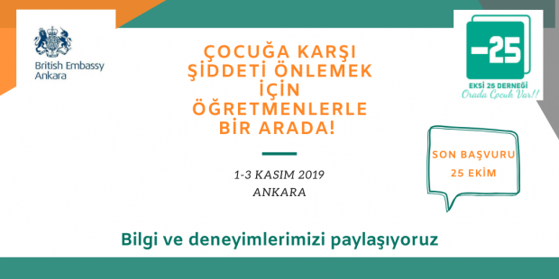 Eskişehir'de çocuk hakları alanında çalışma yürüten Eksi 25 Derneği, çocuğa karşı şiddetle mücadele için Kasım ayında Ankara'da öğretmenlere yönelik farkındalık eğitimi gerçekleştirecek. Eğitime son başvuru tarihi 25 Ekim 2019 Cuma.