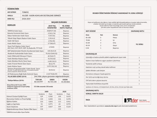 Karnede yer alan notları, Türkiye’nin 12 yıldır aynı sınıfta kaldığını ortaya koydu: Karar alma mekanizmalarında kadının adı hala yok! KA.DER, “Eşitlik beklemeyecek, kadınlar toplumun her alanında hak ettikleri yere gelene kadar mücadelemiz sürecek” diyor.