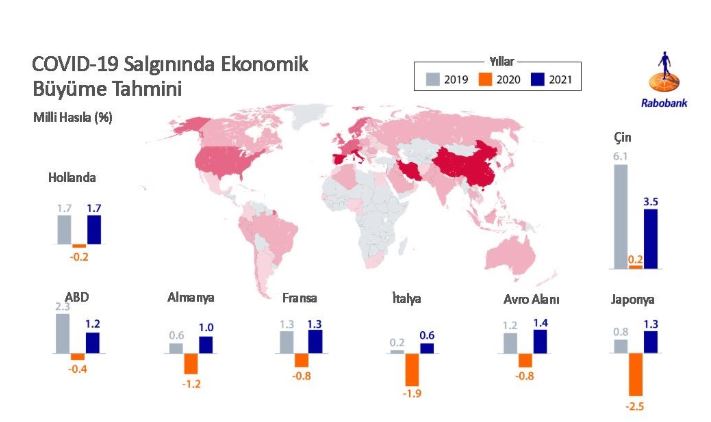 Çin’in Wuhan şehrinde başladığı iddia edilen salgının küresel ölçekte derin ekonomik sonuçlarının da olacağı muhakkak. Küresel ekonomik dalgalanmayı analiz eden Rabobank varsayılan küresel ekonomi analiz durumunu “salgın senaryosu”na dönüştürmüş durumda. Rabobank’ın Küresel Ekonomik Görünüm raporuna göre neredeyse tüm G10 ülkelerinde 2020 yılında durgunluk bekleniyor. Kuruluş, COVID-19 Krizi’nden önce %2,9 olan küresel ekonomik büyüme tahminini COVID-19 nedeniyle %0.7 olarak güncellemek zorunda kaldı. 2021’de %3,2’lik bir toparlanma beklediğini ancak bu değerlendirmenin net olmaktan uzak olduğunu vurguluyor. Çin’in büyümesinin 2020’de sıfıra düşmesini bekliyor. Kuruluşun analizlerine göre en büyük düşüş %2,5 ile Japonya, %1,9 ile İtalya ve %1,2 ile Almanya’da yaşanacak [5].