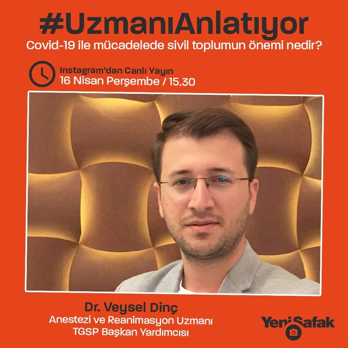 Türkiye Gençlik STK’ları Platformu (TGSP) Başkan Yardımcısı, Anestezi ve Reanimasyon Uzmanı Dr. Veysel Dinç, Uzmanı Anlatıyor Instagram Canlı Yayınında Yeni Şafak Editörü Fatma Çelik’in konuğu oldu. Covid-19 ile mücadelede sivil toplumun önemine değinen Dr. Dinç, STK’ların bu süreçte önemli bir rol üstlendiğine dikkat çekerek, “STK’ların kendi aralarındaki iletişimi sosyal ağlar üzerinden devam ettirmesi, ortak bir ses olmak açısından, ne yapıldığını birbirinden takip etmek açısından çok önemli” dedi.