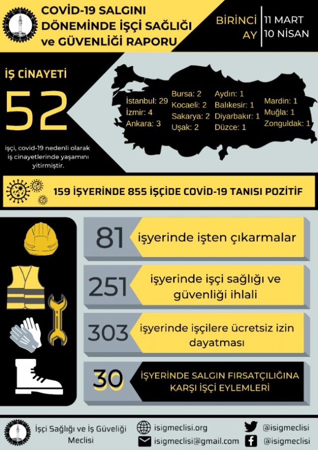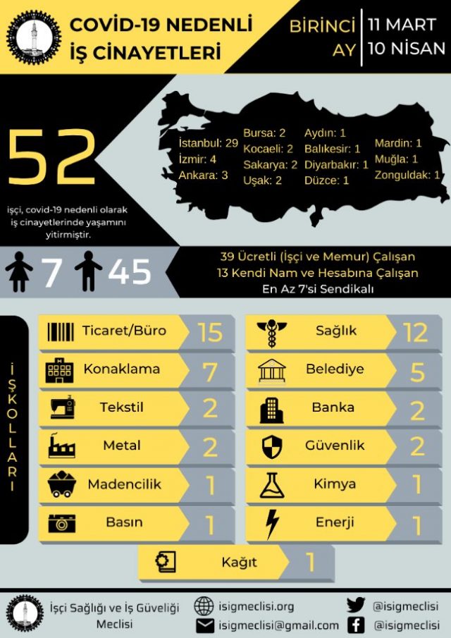İlk salgın vakasının açıklandığı tarih olan 11 Mart 2020 tarihi ile 10 Nisan 2020 tarihi arasında yani salgının ilk bir ayında Türkiye’de Covid-19 nedenli en az 52 iş cinayeti yaşandı.