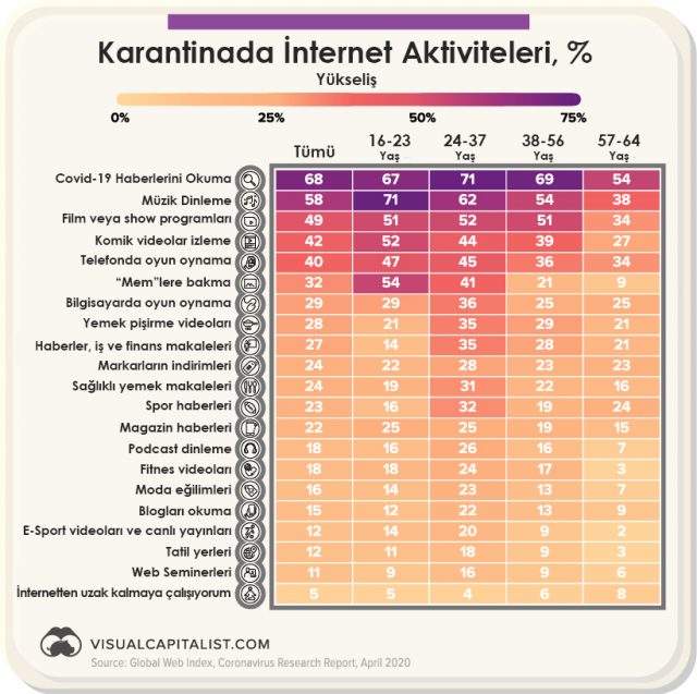 Araştırmada en çok öne çıkan bulguya göre insanların %68’i medyadaki Covid-19 haberlerine ilişkin güncellemeleri yakından takip ediyor ve bunun önde gelen internet aktivitesi haline geldiğini vurguluyor. Fakat sadece 16-23 yaş arasındaki Z kuşağının %71’i güncel koronavirüs haberlerini araştırmaktan ziyade müzik dinleme etkinliğinin daha yüksek olduğunun altını çiziyor.