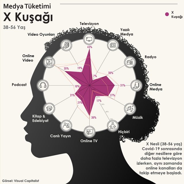 38-56 yaş aralığındaki X kuşağı ise diğer kuşaklara göre televizyon izlemeye daha yatkın görünüyor. X kuşağının %45’i salgın döneminde televizyona odaklanmış durumdayken aynı zamanda %35’i de online video izlemekte.