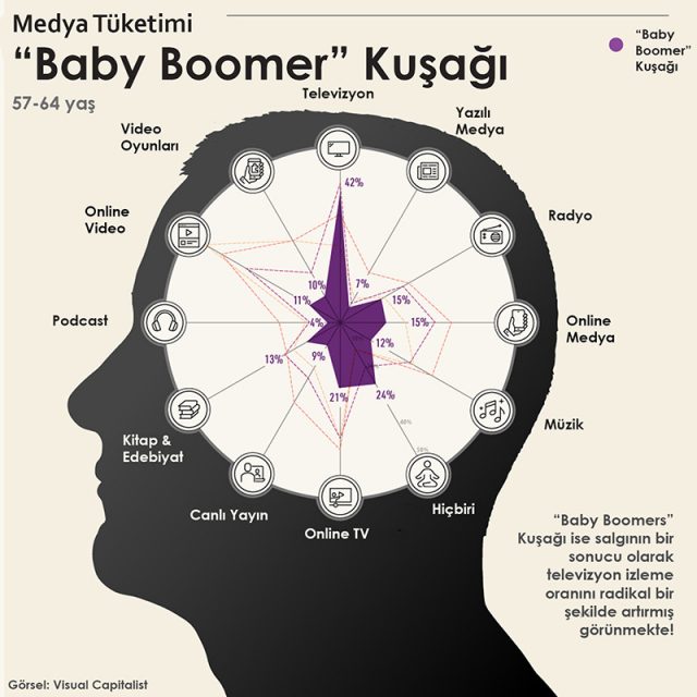 Araştırmada “Baby Boomer” kuşağı olarak adlandırılan ve 57-64 yaş aralığındaki katılımcıların ise salgın sonucunda televizyon izleme oranı radikal bir şekilde artış göstermiş durumda. Bunun yanında yüksek yaş aralığındaki nesil neredeyse hiç podcast (%4) dinlemiyor ve yazılı medyayı takibi (%7) de giderek azalmış gözükmekte.