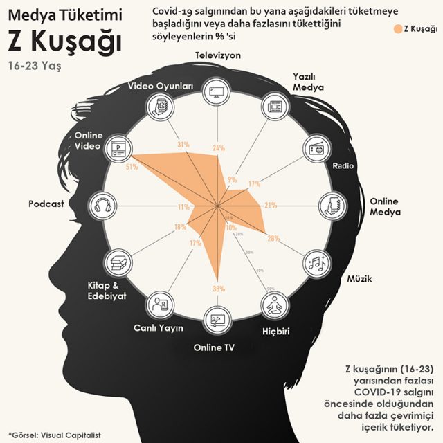 Genç nesil online videoların yanında kısmen (%24) televizyon izlemekteyken, daha çok video oyunları (%31) oynuyor. Ayrıca genç kuşakta online TV izleme faaliyeti (%38), konvansiyonel olarak TV izlemeye göre daha revaçta. Bununla birlikte Z kuşağının yarısından fazlası salgın öncesinde olduğundan daha fazla online içerik tüketmekte.