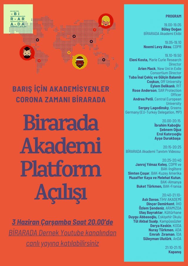 Bu oluşumun tanıtımı amacıyla 3 Haziran 2020 Çarşamba, Saat 20.00’da(TR) düzenlenecek “Barış Akademisyenleri Corona Zamanı’nda Birarada!” başlıklı çevrimiçi açılım / dayanışma etkinliğine Youtube üzerinden katılabilirsiniz.