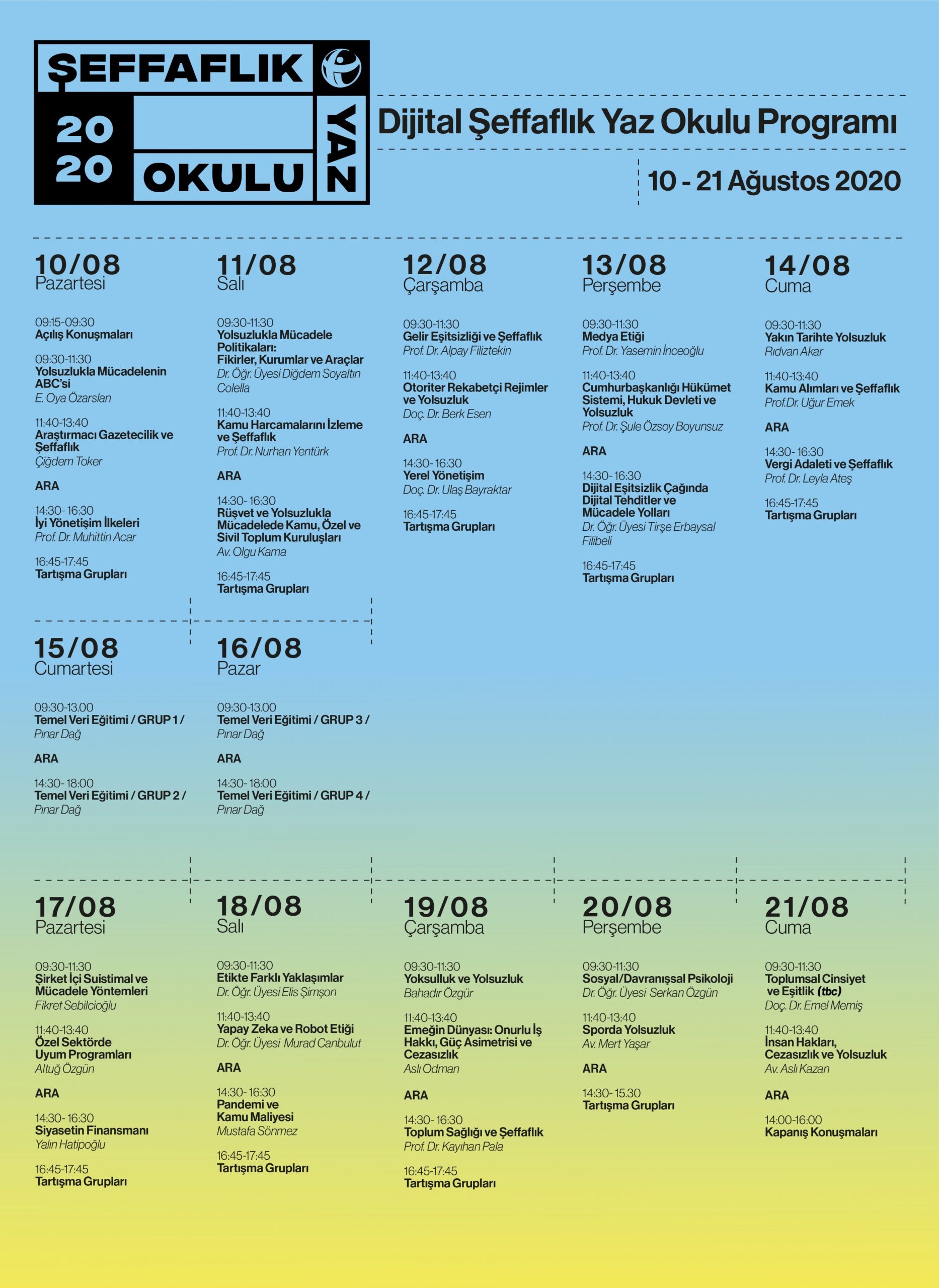 Farklı kentlerden ve disiplinlerden üniversite öğrencilerinin katılımıyla; şeffaflık, hesap verebilirlik ve katılımcılık kavramları, yine farklı saha ve disiplinlerdeki izdüşümleriyle tartışılacak. Yolsuzlukla mücadele odaklı bu iyi yönetişim okulunda; etik, siyasetin finansmanı, yerel yönetişim, özel sektörde yolsuzlukla mücadele, uyum politikaları, temel veri eğitimi ve sporda yolsuzluk gibi eğitim seminerlerinin yanı sıra sivil toplum örgütlerinin tanıtım ve tartışma oturumlarına, önde gelen araştırmacı gazetecilerin söyleşilerine katılma imkânı bulabilirsiniz.