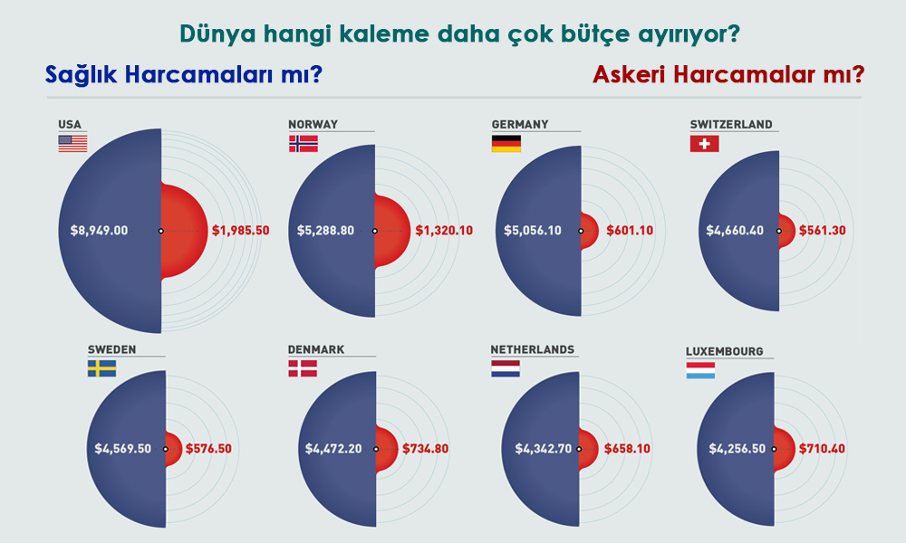 “Dünya neye daha çok para harcıyor? Sağlığa mı yoksa savaşa mı? Pixlparade’dan Eva Finch 46 ülkede askeri harcamalarla sağlık harcamalarını mukayese etti. Hangi ülkelerin askeri bütçeden çok sağlık bütçesini öncelediğini araştırdı.”