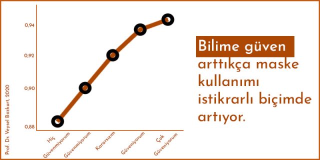 Araştırmada bilime güven arttıkça maske kullanımın artışı da bir diğer bulgu. Katılımcılar arasında bilime güvenmeyen kesim maske kullanımı konusunda da esnek davranmakta. Bununla birlikte bilimsel verilere sıcak yaklaşan kanat karantina önlemleri konusunda daha hassas.