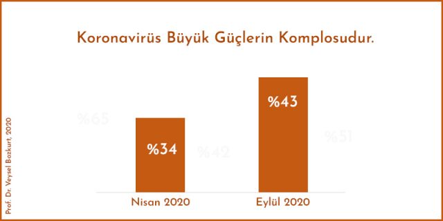 Bu arada paranoidler komplo teorilerine sarılmışlardı. Üst akıl yeni bir oyun kurguluyordu onlara göre. Bir delile dayanmadan yazdıkları için, herkesin senaryosu kendi işine gelecek şekildeydi. Üstelik tutmazsa çok kısa sürede değiştirebiliyorlardı. Birazda bunların etkisiyle anketi cevaplayanların yüzde 34’ü koronavirüsü büyük güçlerin komplosuna bağlıyorlardı. İşin ilginci bu oran Eylül 2020’de azalmak yerine artmış ve yüzde 43’e yükselmişti. Nisanda virüsün laboratuvarda üretildiğine inananlar ise yüzde 52’ye yükselmişti.