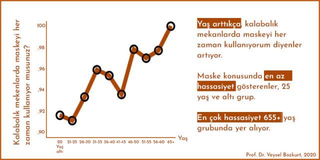 Araştırmada katılımcıların yüzde 93,5’u maske yüzde 84,2’si mesafe kuralına uyduğunu söylemektedir. Fakat maske kurallarına uyanların büyük bir çoğunluğunu yaşlı nüfus oluşturuyor. Genç nüfus ise maske kullanımı konusunda en fazla zafiyet gösteren grubu teşkil etmekte.