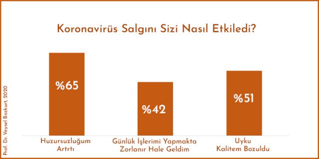 Nisan ayı içinde 5300 kişiyi kapsayan bir çevrimiçi anket gerçekleştirdik. Ankete katılanların yüzde 65’i huzursuzluğum arttı, yüzde 42’si günlük işlerimi yapmakta zorlanır hale geldim, yüzde 51’si uyku kalitem bozuldu diyordu.