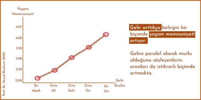 Araştırmada koronovirüs salgını döneminde ekonomik daralmanın da getirdiği sonuçlar nedeniyle dikkate değer bir nokta da gelir ve yaşam memnuniyeti arasındaki bağlantı. Araştırmaya göre gelir arttıkça belirgin bir biçimde yaşam memnuniyeti de artıyor. Buna paralel olarak mutlu olduğunu söyleyenlerin oranı da istikrarlı bir biçimde artış göstermekte!