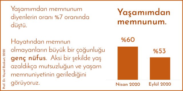 İnsanların mutluluklarına ilişkin geçmişte yapılan çalışmalar U şeklinde bir ilişkiyi ortaya koyar. Yani gençken insanlar daha mutludurlar; orta yaşta mutluluk geriler ve ileri yaşlarda tekrar yükselir. Yakın zamanda 20’den fazla bir ülkede yapılan çalışma U şeklinde ilişkinin değiştiğini ortaya koyuyor. Benzer durum bizim için de geçerli. Yaş azaldıkça mutsuzluğun ve yaşam memnuniyetinin gerilediğini görüyoruz. Burada etkili olan faktör, istihdamda gerileme, geçim derdi ve virüs yüzünden daralan hareket alanı diye düşünüyorum.