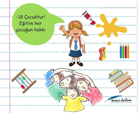 “-18 Çocuktur” diyoruz çünkü Türkiye’nin de imzalamış olduğu Birleşmiş Milletler Çocuk Hakları Sözleşmesi’nde 18 yaşının altındaki bütün bireyler çocuk olarak belirlendi. Aileler, özellikle ekonomik zorluklar sebebiyle çocuklarını eğitimden alma, evlendirme, çalıştırma gibi yollarla çocukları haklarından alıkoyabilirler. Özellikle göç gibi afetler çocukların haklarından yararlanamama riskini artırır. Bu sebeple Mavi Kalem -18 Çocuktur Kampanyası ile yerel ve mülteci toplumda çocuk hakları ile ilgili farkındalık yaratmayı amaçlar.